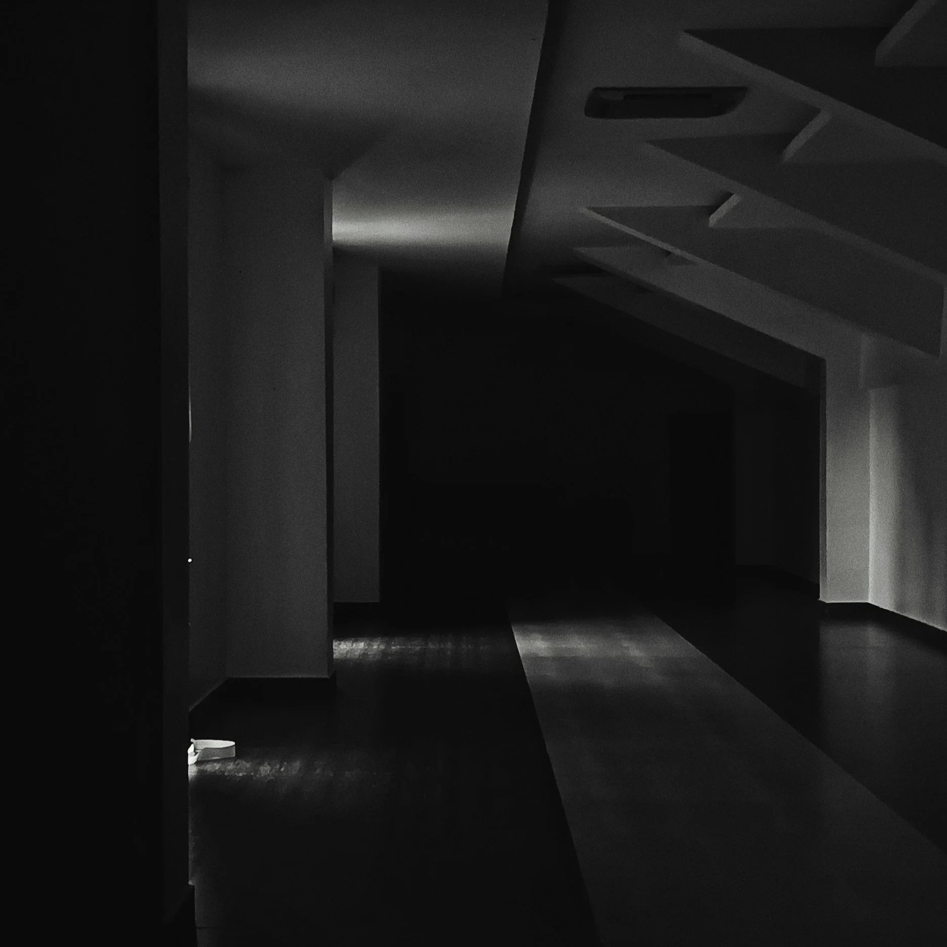 Image depicts a dark empty hallway in a facility. The walls are bare and darkness of the image obscures he details of the floor.