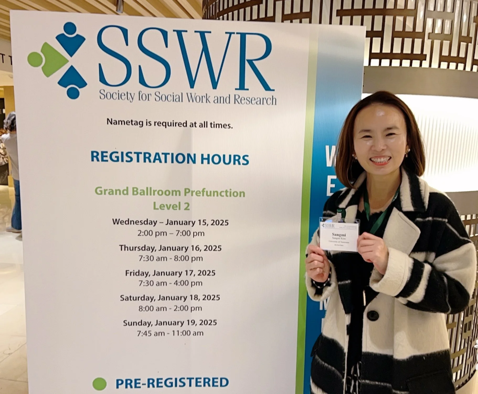 Image depicts Sangmi Kim, a Korean woman with straight shoulder-length hair, is smiling and holding her name badge while standing next to a large signboard for the Society for Social Work and Research (SSWR) 2025 Annual Conference. She is wearing a black-and-white patterned coat.